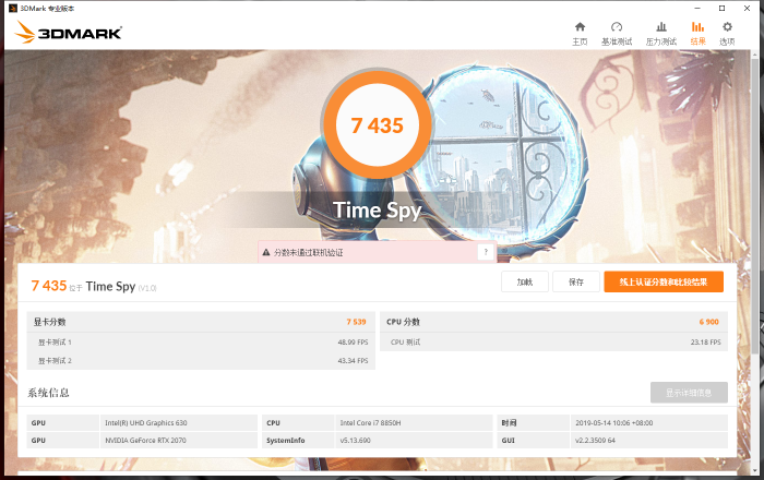 在3D Mark中,机械革命深海泰坦X9Ti-R还拿到了Time Spy(基准测试)综合得分7435分,显卡得分7539分,CPU得分6900分。
