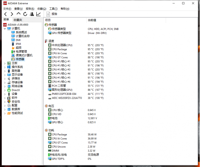 1小时后,我们从拷机结果可以看到CPU的温度为95°,功耗为58W,GPU温度为86°,功耗为115W,由此来看,机械革命深海泰坦X9Ti-R散热模组的散热效果还是比较理想的。