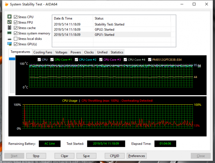 双高精度涡轮风扇+5根导热铜管配置的散热效果到底如何呢?我们用AIDA64拷机软件稳定性测试勾选CPU+FPU+cache+systemmemory+GPU进行拷机测试,拷机时间为1小时。在拷机的1小时过程中,并未发现降频的现象。