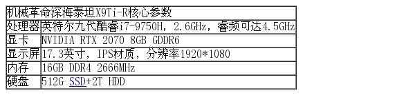 游戏本最注重的是性能,下面我们先了解一下机械革命深海泰坦X9Ti-R的配置参数。这款游戏本搭载了主频2.6GHz的英特尔九代酷睿i7-9750H处理器,采用成熟的14nm工艺制程,拥有6核12线程处理能力,显卡则是NVIDIA的RTX 2070,拥有8G显存。