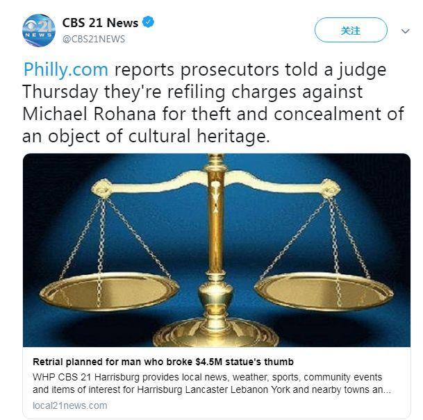当地时间5月16日,美国联邦检察官麦史文(William M. McSwain)告知法官,将以盗窃和藏匿文化遗产物品的罪名再次起诉罗哈纳。