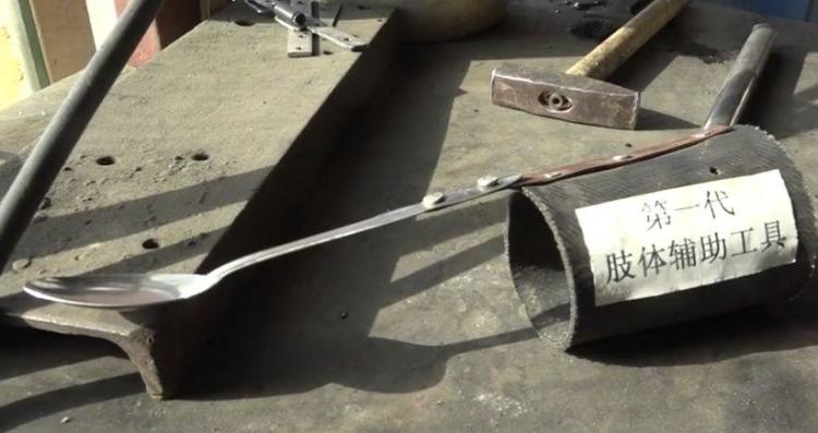 第一次研究假肢,孙吉发想得就是先解决自己吃饭的问题,他用人力车外壳做的橡胶筒扣在胳膊上,然后让哥哥和家人帮忙把勺子固定上,第一代铁手就做好了。
