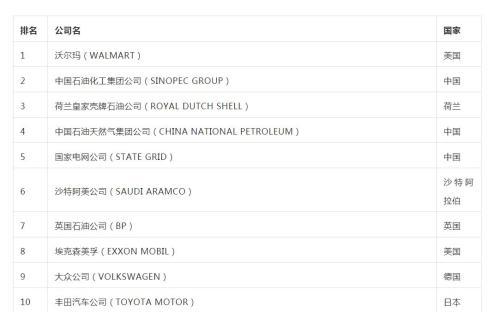 具体看,沃尔玛位列第一,中石化第二,壳牌第三,中国石油和国家电网分列第四、第五位,新上榜的巨型石油公司沙特阿美则位居第六位。