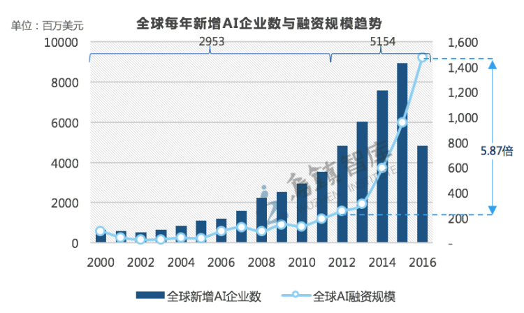 数据显示,从2000年开始,全球人工智能企业的增速很快,总数达到了8107家,平均每天诞生约1.39家。透过数据发现,过去五年是人工智能发展的重要阶段:全球超过60%的人工智能企业诞生于过去五年间,在2012-2016年,全球人工智能企业新增5154家,是此前12年的1.75倍左右。