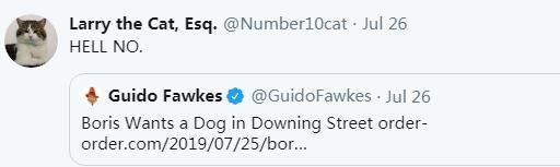 “英国第一猫”拉里的社交媒体账户转发“约翰逊想要在唐宁街养狗”的推特,并评论称“天啊,不要”。图片来源:社交网站截图。