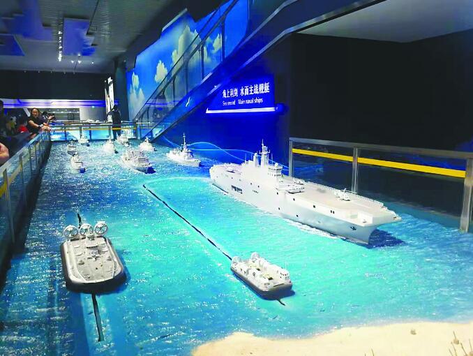 谈到新时代解放军装备的发展,海军大型装备,特别是成体系的水面战斗舰艇编队是一大亮点。在海军武器装备技术展厅,航母辽宁舰模型出现在大型航母战斗群中。在这个庞大的海上编队中,前有水下潜艇探路,中间有防空驱逐舰、通用型护卫舰的层层保护,后方还有快速补给舰的支持,背后的电视背板则在循环播放航母战斗群的不同作战模式。另一侧的水面主战舰艇介绍中,由大型两栖登陆舰、“欧洲野牛”气垫登陆船、气垫登陆艇组成的登陆船队,同时为驱逐舰和护卫舰横向补给的补给舰,以及潜艇支援舰等组成不同的任务组合,直接反映了当前解放军海军装备体系的发展成果与未来趋势。