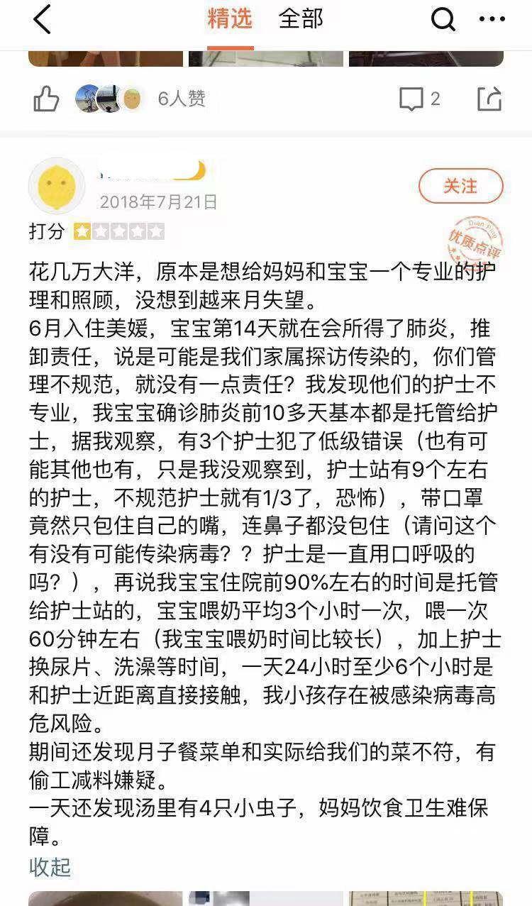去年6月,广州一对年轻夫妻喜得一子,为了更好照料宝宝,选择了沙面岛一家月子中心28天的月子服务,花费了数万元。可没想到在这期间,宝宝感染了肺炎,夫妻二人认为月子中心照顾不周,月子餐的汤里有虫,存在不规范的现象,遂在大众点评网进行了差评。