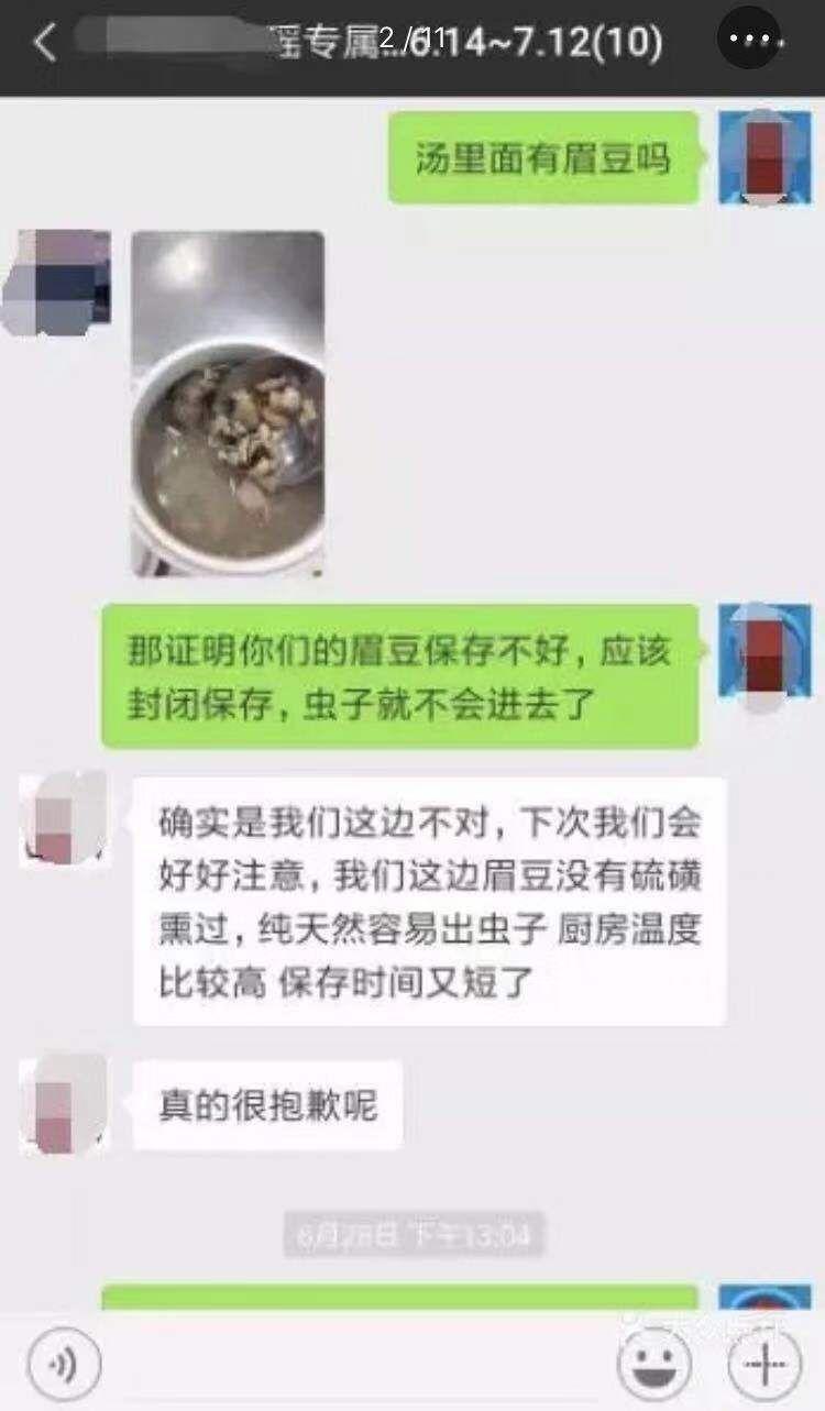 其中一张为微信聊天截屏,对话内容针对汤的内容进行解释,对方回复称“确实是我们这边不对,下次我们会好好注意,我们这边眉豆没有硫磺熏过,纯天然容易出虫子厨房温度比较高保存时间又短了”、“真的很抱歉呢”等内容。