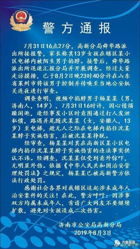调查查明,视频中掐脖男子杨某某(男,济南人,14岁),7月31日16时许,因心情烦躁闲逛,途径事发小区时,意图通过打人发泄私愤,路遇并尾随沈某某(女,安徽人,13岁)至电梯,趁无人之际,在电梯内掐住沈某某脖子实施伤害,后被沈某某挣脱。
