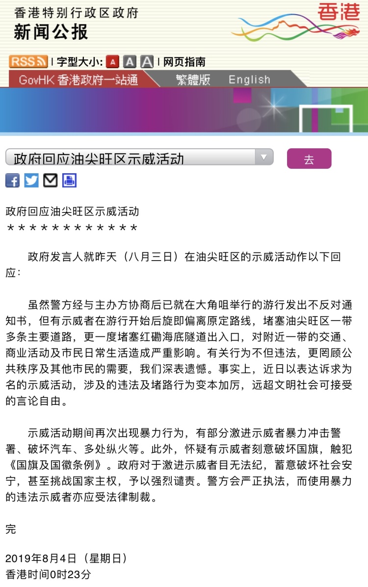 政府发言人就昨天(八月三日)在油尖旺区的示威活动作以下回应: