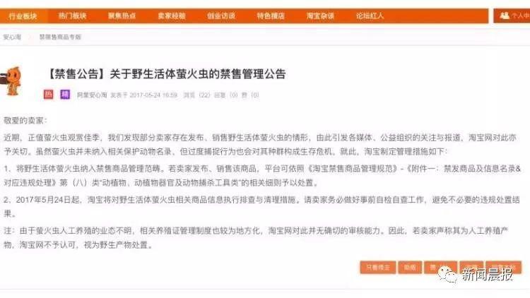 “曾经有多家媒体前往各地调查,完整地呈现出一条[顾客下单–‘养殖场’通知–村民捕抓–虫头收购–‘养殖场’发货–商场、公园、景区、房地产等展出放飞]的链条。淘宝等平台也加入到萤火虫保护队伍中,禁止网店经营和快递运输活体萤火虫。”