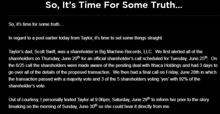 斯科特⋅波切塔表示,他已在6月25日提前通知身为股东之一的霉霉父亲;此外,5位股东中有3位同意该转让协议。