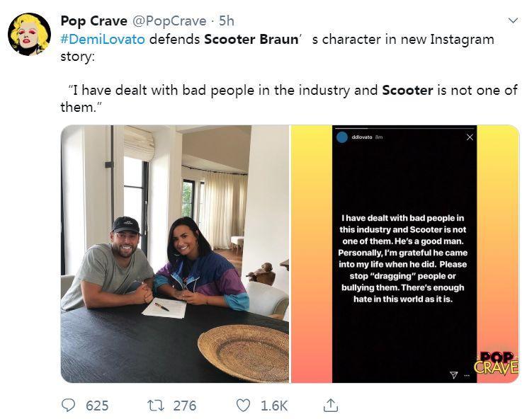 美国歌手黛咪⋅洛瓦托为斯库特⋅布劳恩的人品打call,称“我接触过这个行业里很多坏人,但斯库特绝对不是他们中的一个”。