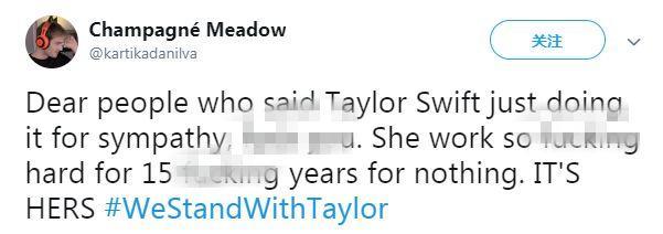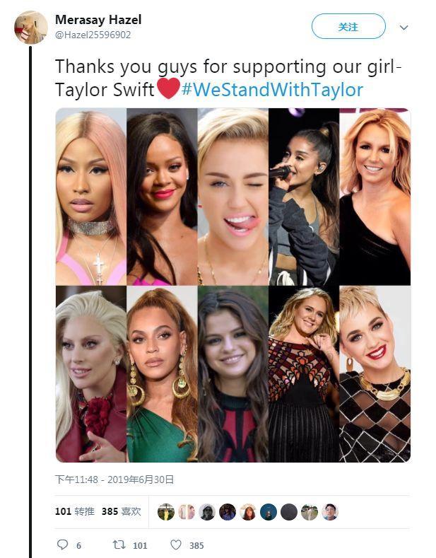 霉霉发声后,得到了很多明星和粉丝们的支持。网友们也发起了#WeStandWithTaylor的活动。