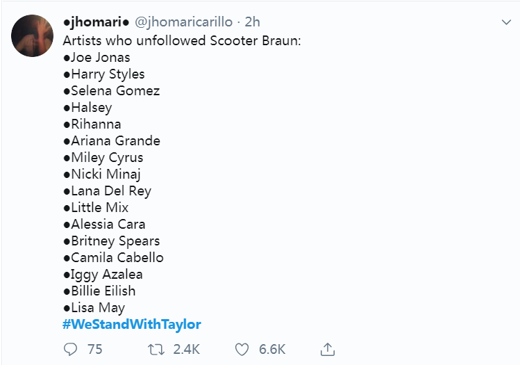 下面这些大牌明星(包括蕾哈娜,傻脸娜在内)也取消关注斯库特⋅布劳恩的社交媒体账号,站在了霉霉这边。