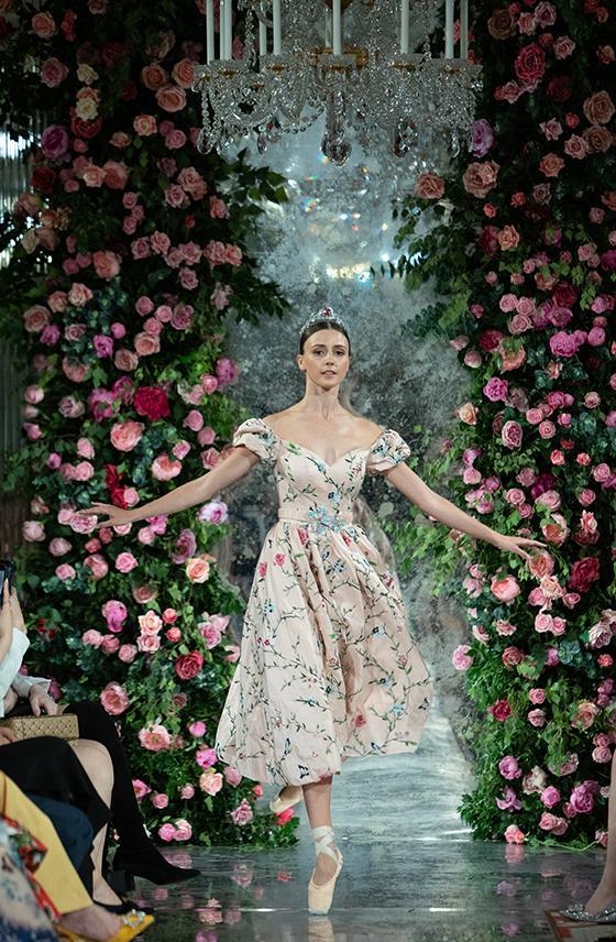 一段充溢着皇家旋律的芭蕾舞之后,模特们佩戴着茜茜公主系列珠宝穿梭于大理石建筑,皇室宫廷的浮雕作品和鲜花营造的浪漫花园之中开启大秀的序幕。