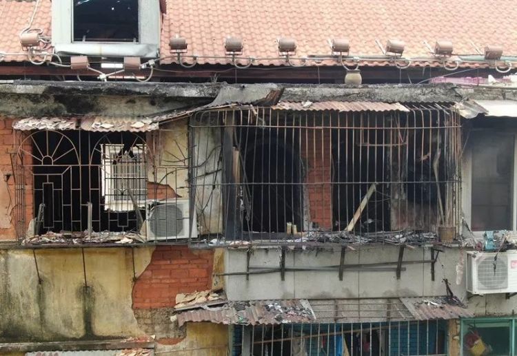 明火被扑灭后,父亲和女儿坐在防盗网上