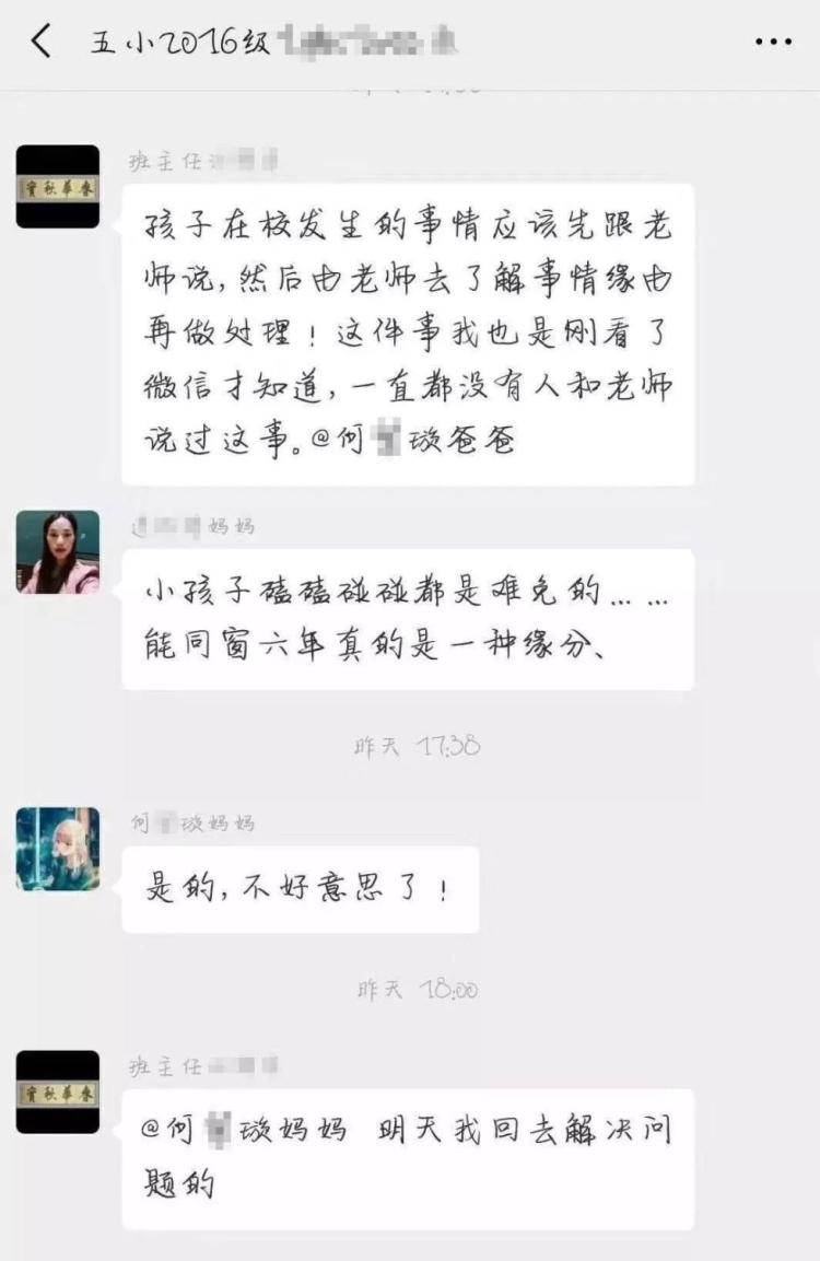 另据报道,上饶市第五小学一名老师称,刘某宸与何某某发生纠纷后,班主任已经着手在解决这件事了,并且事发当天早晨邀请双方父母来学校面谈,不过刘某宸家长并未来到学校。