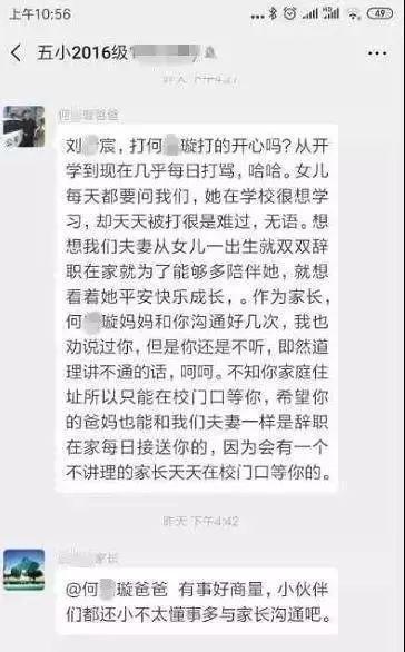 上饶五小命案发生后,一张流传甚广的聊天记录显示,在该涉事班级的家长微信群里,曾有家长质问刘某宸为什么天天打自己的女儿何某某,并表示:“既然道理讲不通,不知你家庭住址,所以只能在校门口等你,希望你的爸妈也能和我们夫妻一样是辞职在家每日接送你的,因为会有一个不讲理的家长天天在校门口等你的。”
