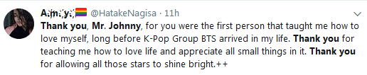 谢谢你,Johnny, 早在韩国流行团体BTS来到我生命中之前,你是第一个教会我如何爱自己的人。谢谢你教会我如何热爱生活并感恩生命中每一件小事。感谢你让那些明星闪耀光芒。