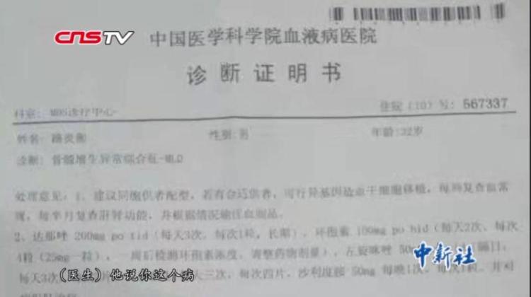 路炎衡介绍,2011年底的一天,他无故开始流鼻血、脸色苍白、心脏难受,当时在当地医院检查,血红蛋白40多个、血小板20多个,疑似为血液病,随后前往北京、天津的医院治疗,确诊为骨髓增生异常综合征。