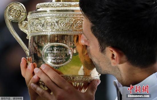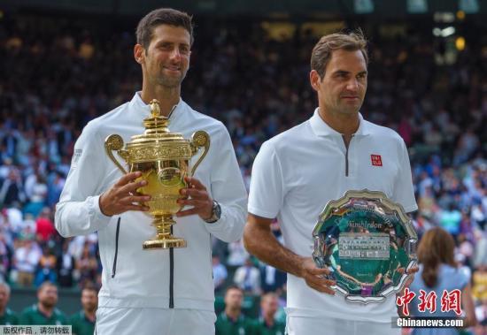 当地时间7月14日,温布尔登网球公开赛男单决赛中,赛会1号种子德约科维奇与“草地之王”费德勒上演史诗对决。德约科维奇最终以7-6(5)、1-6、7-6(4)、4-6、13-12(3)险胜瑞士天王,豪夺生涯第5座温网奖杯,这也是他第16个大满贯冠军。图为德约科维奇(左)获得温网冠军,费德勒夺得亚军。