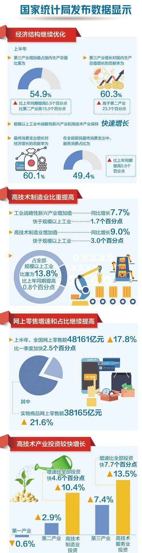 数据显示,经济结构转型升级效果显现,增长质量持续提升。上半年第三产业增加值占GDP比重为54.9%,比上年同期提高0.5个百分点,比第二产业高15.0个百分点。第三产业增加值对国内生产总值增长的贡献率为60.3%,高于第二产业23.2个百分点。规模以上工业中,战略性新兴产业和高技术产业保持快速增长。战略性新兴产业增加值同比增长7.7%,高技术制造业增加值同比增长9%,分别快于规模以上工业增加值1.7个和3个百分点。
