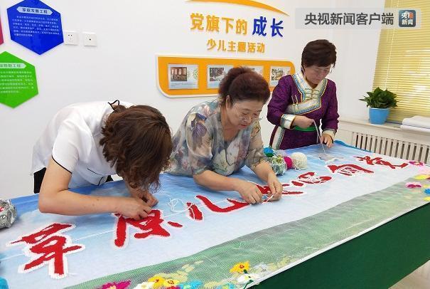 △社区的蒙古族、汉族同胞正在联手制作刺绣作品《草原儿女心向党》。(国广记者蔡靖骉拍摄)