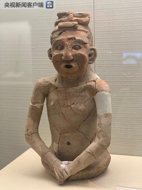 △红山文化陶人,距今6660年-5000年,它在敖汉旗出土。从装束来看,他应该是地位高的统治者或巫者。这件陶人是红山文化发现的一尊最大最完整的复原陶人,被誉为“中华祖神”。(央视记者沈忱拍摄)