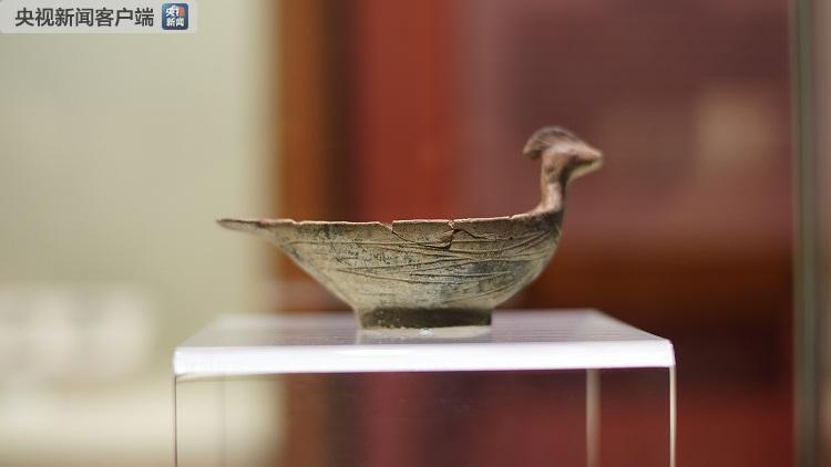 △这件陶凤杯诞生于新石器时代中期,2004年出土于翁牛特旗解放营子。杯上凤冠、翅、尾的造型与中华传统的凤颇为相似。《尔雅》中记载,凤的雏形是鸡头、鱼尾。这件陶凤杯将凤的雏形完全显现,这在史前文物中是首次发现,因此有“中华第一凤”之称。 (央视记者彭汉明拍摄)