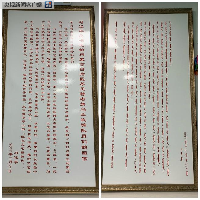 △排练厅里张贴着蒙汉双语的习近平总书记给内蒙古自治区苏尼特右旗乌兰牧骑队员们回信。(央视记者沈忱拍摄)