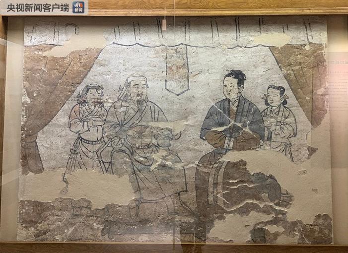 △墓主人对坐图。出土于赤峰市元宝山区沙子山元墓。因蒙古族有秘葬的传统,元墓壁画非常罕见。壁画中男主人和男仆发饰,是元代蒙古族男子的传统发式“婆焦”,女主人身着左衽服饰。(央视记者沈忱拍摄)
