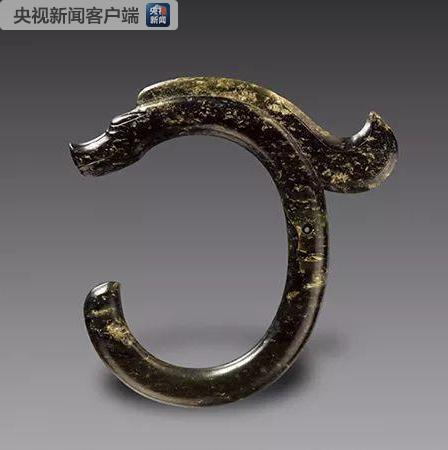 △玉龙,高26厘米,原件藏于中国国家博物馆。在玉龙的背部有一条对穿单孔,如果以绳悬挂,龙的首尾恰好处于同一水平线上,可见孔的位置是经过周密计算的。这件碧玉龙是目前国内发现最早、体积最大、制作最精良的龙形玉器。(资料图)
