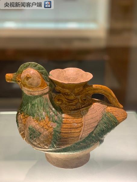 △三彩鸳鸯壶,出土于赤峰市松山区王家店辽墓。这种陶瓷器称之为“辽瓷”。它继承了“唐三彩”的传统手法,又有自己的特点,被称为“辽三彩”。(央视记者沈忱拍摄)