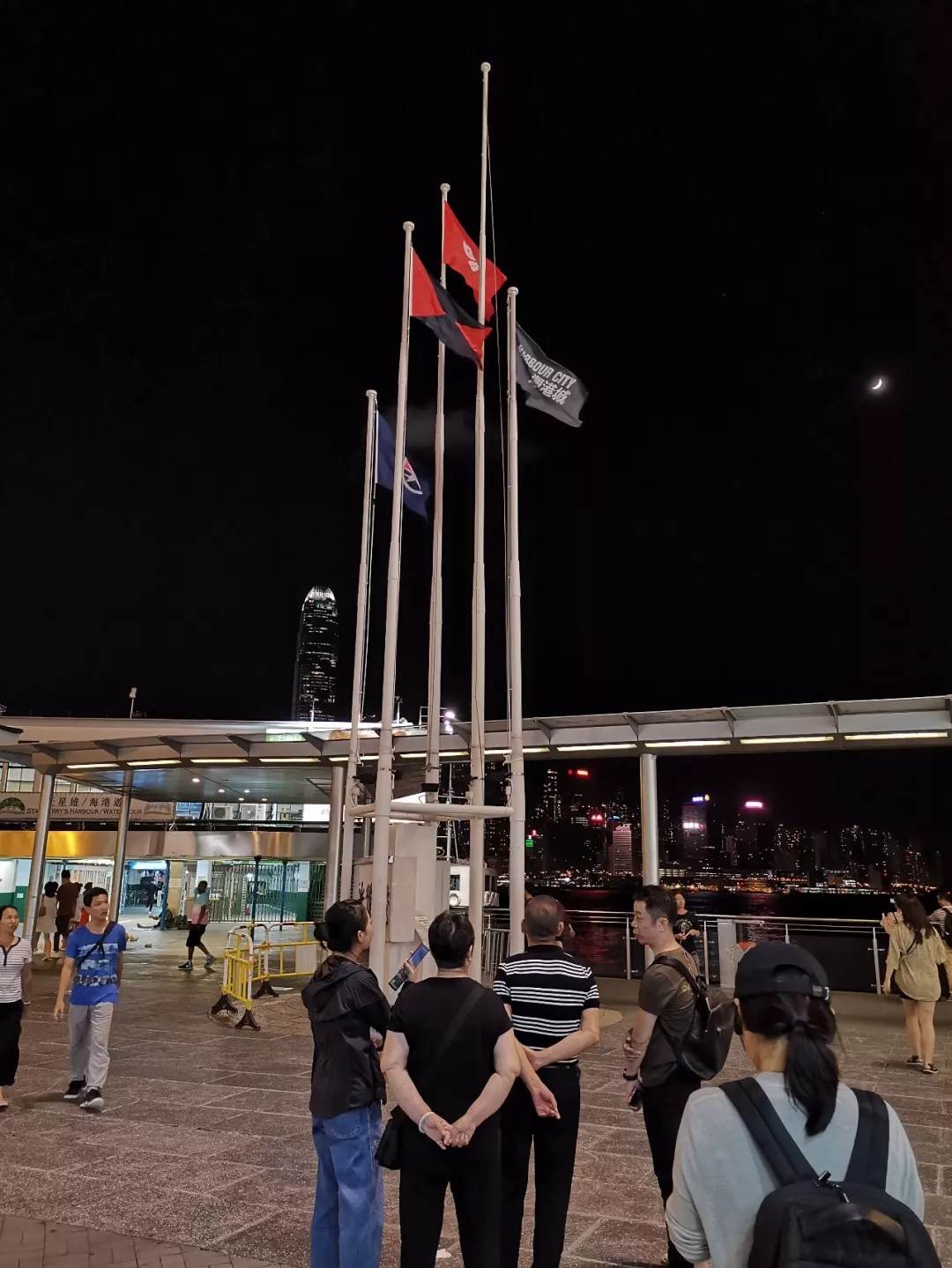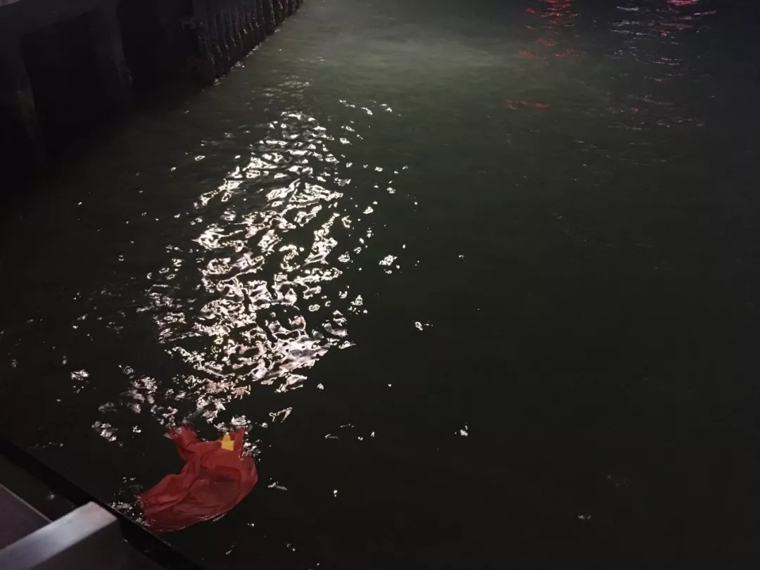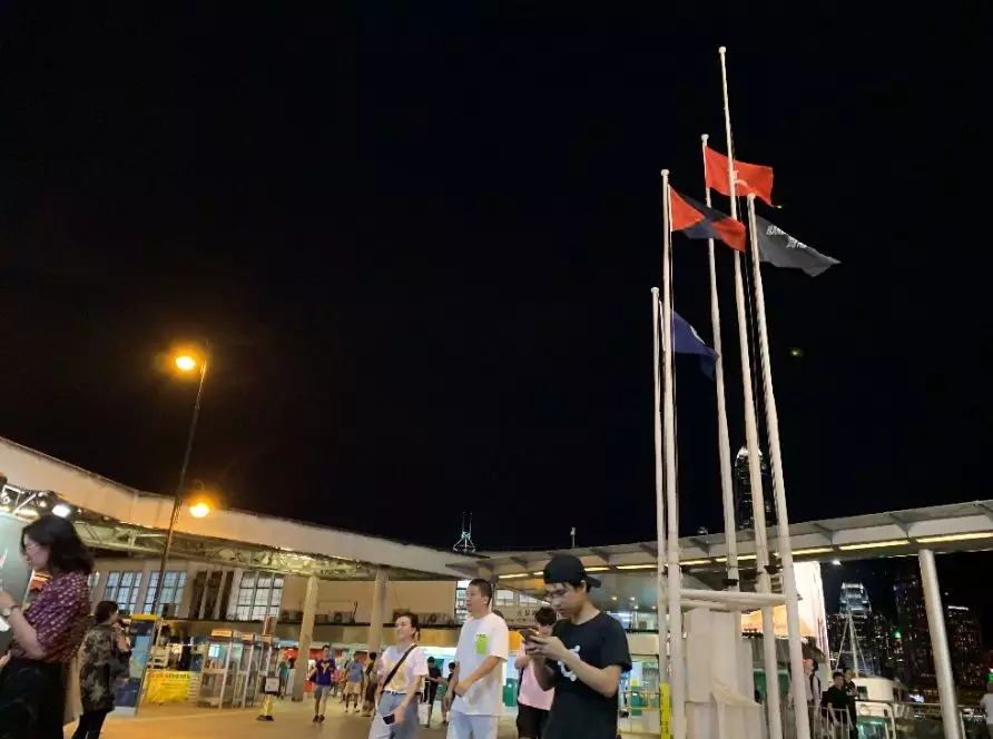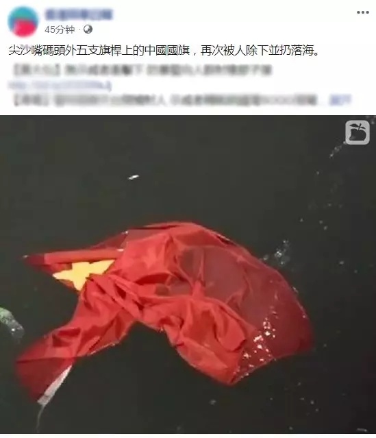 就在今晚19时30分前后,部分暴徒在尖沙咀码头海港城门前,拆下五支旗杆上的五星红旗,把国旗扔到了海里!