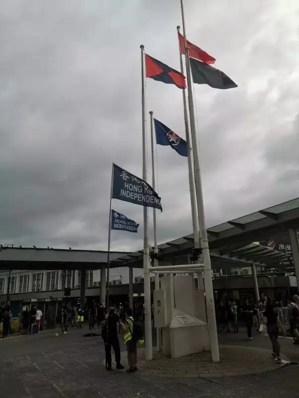 两天前,在同一地点——香港海港城门前,暴徒第一次拆走旗杆上的国旗,扔入海中,还竖起写有“香港独立”的黑色旗帜。