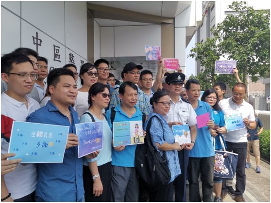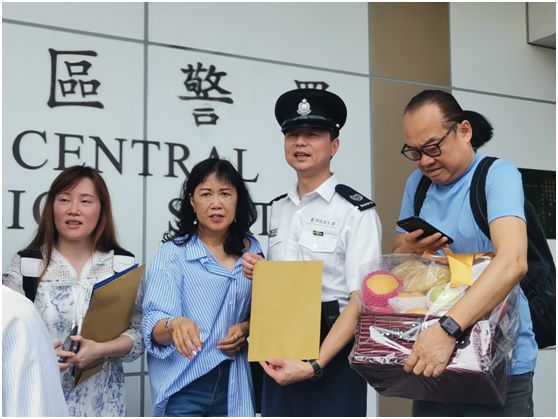 中区警署社区联络主任袁树熙警长向环球时报-环球网表示,从早上9点前后,就源源不断地有团体和热心民众来送物资——鲜花、水果、小朋友画的画、贺卡、感谢信等礼物,他说已有大概30多个团体前来撑警。