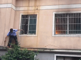上去之后,他先将两个窗户的玻璃敲破,方便卢赟用灭火器往失火的房间灭火。接着,又用铁锤拼命砸防盗窗。砸开一个窟窿后,他试图钻进去。