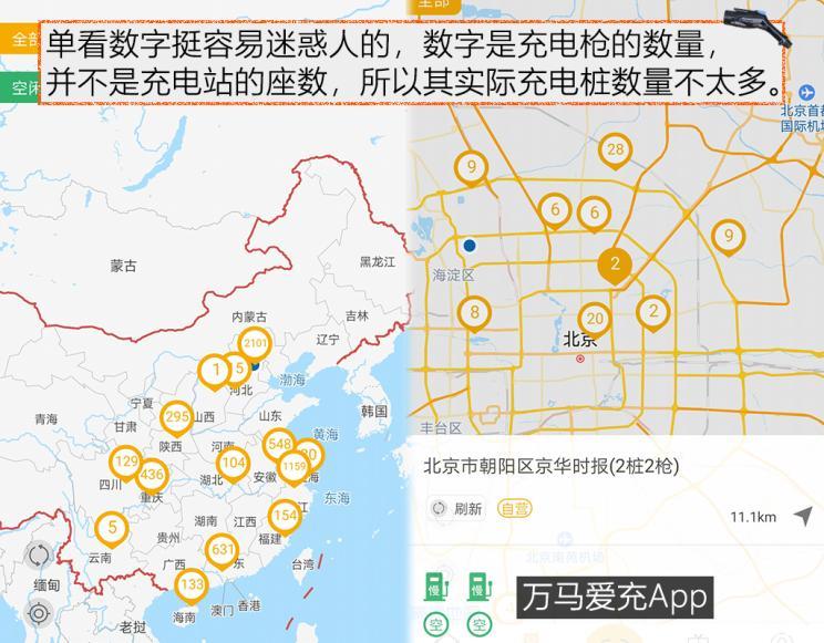 ● 万马爱充/驿充电App——充电桩数量没有优势: