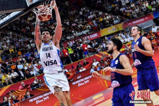 不敌阿根廷后,塞尔维亚于美国这两支赛会夺冠的热门球队只能在5-8名排位赛中相遇。(资料图:图为阿根廷队球员戴克(左)在比赛中扣篮。中新社记者 陈骥旻 摄)