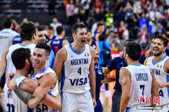 2019年国际篮联篮球世界杯四分之一决赛中,阿根廷队以97比87战胜塞尔维亚队,晋级半决赛,他们也因此锁定了一张东京奥运会门票。图为阿根廷队球员庆祝胜利。中新社记者 陈骥旻 摄