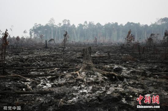 当地时间2019年9月21日,印度尼西亚加里曼丹中部Palangkaraya,森林大火后一片废墟,烟霾笼罩。 图片来源:视觉中国