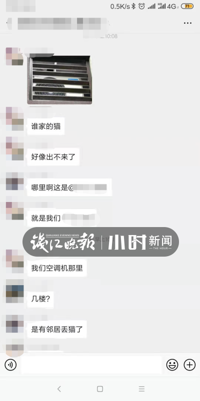 “牛妈”一家住在小区11幢。“我老公在楼下准备上楼,抬头看到空调室外机旁边有一只猫,躲在里面,估计下不来。老公让我发在业主群里,问一下是谁家的猫。”