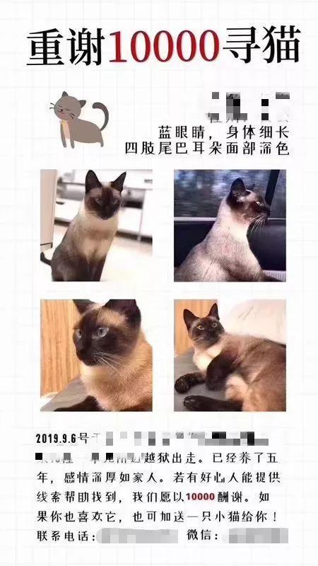 失主在寻猫启事中说,猫是9月6日在小区13幢附近走丢的。“已经养了五年,感情深厚如家人,若有好心人能提供线索帮助找到,我们愿以10000元酬谢。如果你也喜欢它,也可以加送一只小猫给你!”上面有联系电话和微信号码。