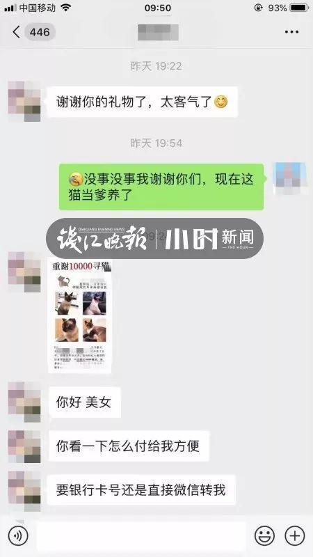 “之前悬赏的时候说过重酬10000元。作为发现猫的人,收不收是我们的事。但是作为失主,应该信守诺言,主动提出。”“牛妈”说,失主压根就没提到酬金,让她惊讶。