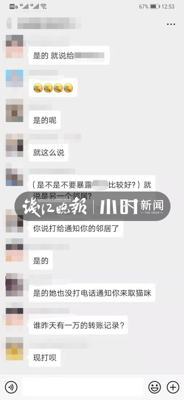 钱江晚报记者通过此微信截图看到,有群友说“就说(酬金)是给另一个邻居?”“你说(酬金)打给通知你的邻居了。”“要不×××(某邻居)就真收下这一万(酬金)先,回头再找机会转回去。”有人发问“谁昨天有一万的转账记录?”有群友回答“现转呗。”