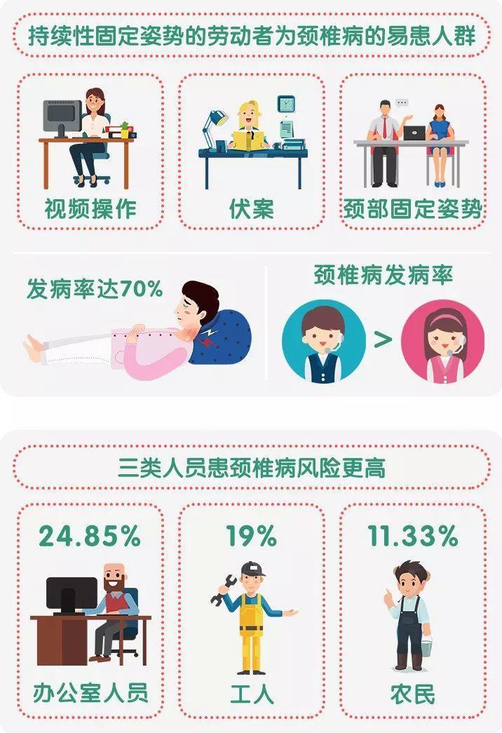 随着工作方式发生改变,对职业病分类与目录加以调整和扩容,让其跟上现代上班族的需求,成为很多人的呼声。在此情境下,颈椎病或将列入职业病,无疑切中了众多上班族的痛点,因为“10个上班族,9个颈椎痛 ”。