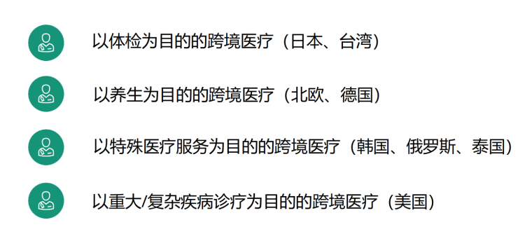 第三,是以特殊医疗为目的的跨境医疗,主要是韩国、新加坡、俄罗斯、泰国较多。一个是和美容,第二个是代孕,代孕有好多需求比较特殊,特别是受政策限制,像俄罗斯、葡萄牙等一些中欧的国家,他们在正常卵子的捐赠方面不像国内在政策上限制这么严,所以有很多在生殖方面有困难的家庭,他们希望通过代孕的方式去解决子嗣的传承问题,这是一项特殊的医疗服务。