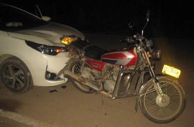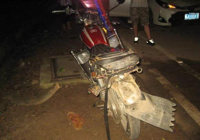 斗门交警大队周警官勘查现场时发现,事故现场为双向两车道,道路照明良好,丰田小车车头右侧深深凹陷,一台摩托车停在小车车头一米处,车尾处有明显碰撞痕迹。▼