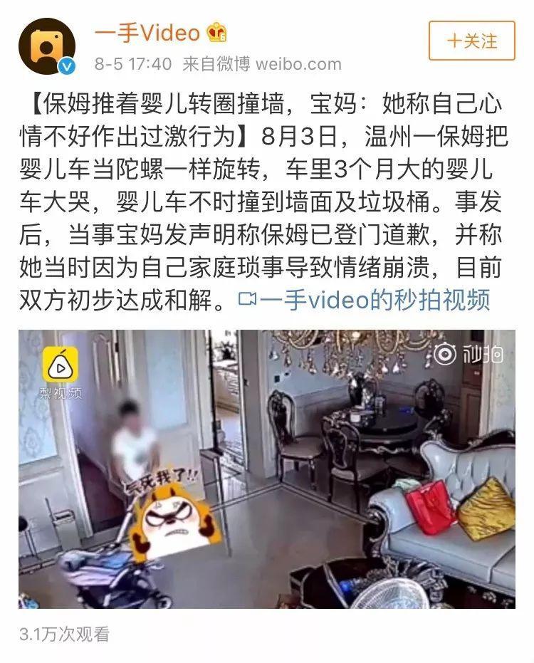 8月初,温州的一名保姆因为“心情不好”而对负责照顾的宝宝做出过激行为,把婴儿车当成陀螺旋转,因为不时碰到垃圾桶和墙面导致车里三个月的宝宝大哭。
